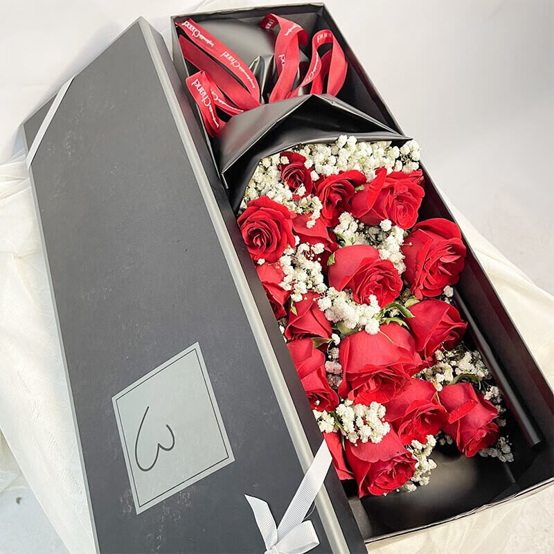 花材 19朵红色玫瑰礼盒,白色满天星点缀
